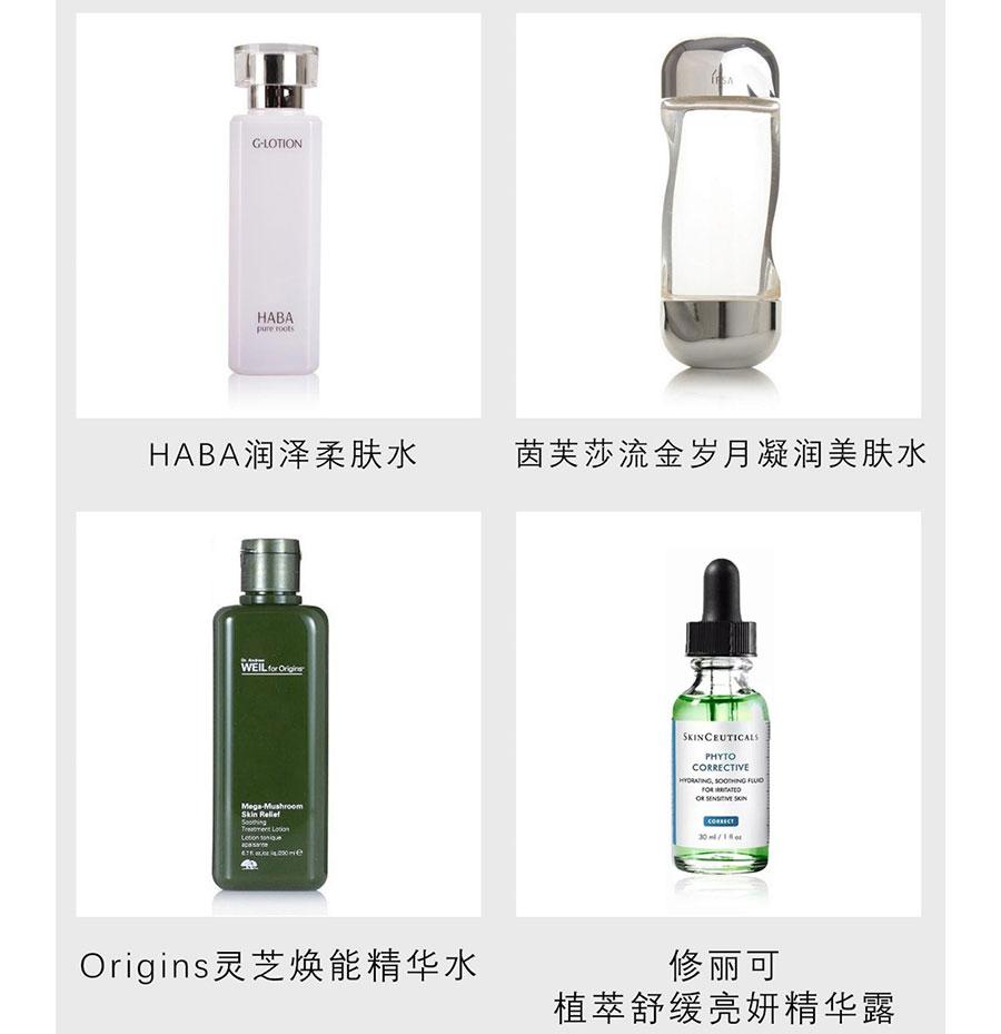 这一类产品往往是一些化妆水或者乳液,比如 HABA 润泽柔肤水,茵芙莎流金岁月凝润美肤水,Origins 韦博士灵芝焕能精华水,以及修丽可的色修(植萃舒缓亮妍精华露)。