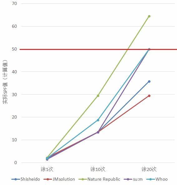 ——即使是按照这个范围里的最高量 1.5mg/cm2 来算,一个 SPF50 的防晒霜,能达到的防晒效果只有不到 SPF20…